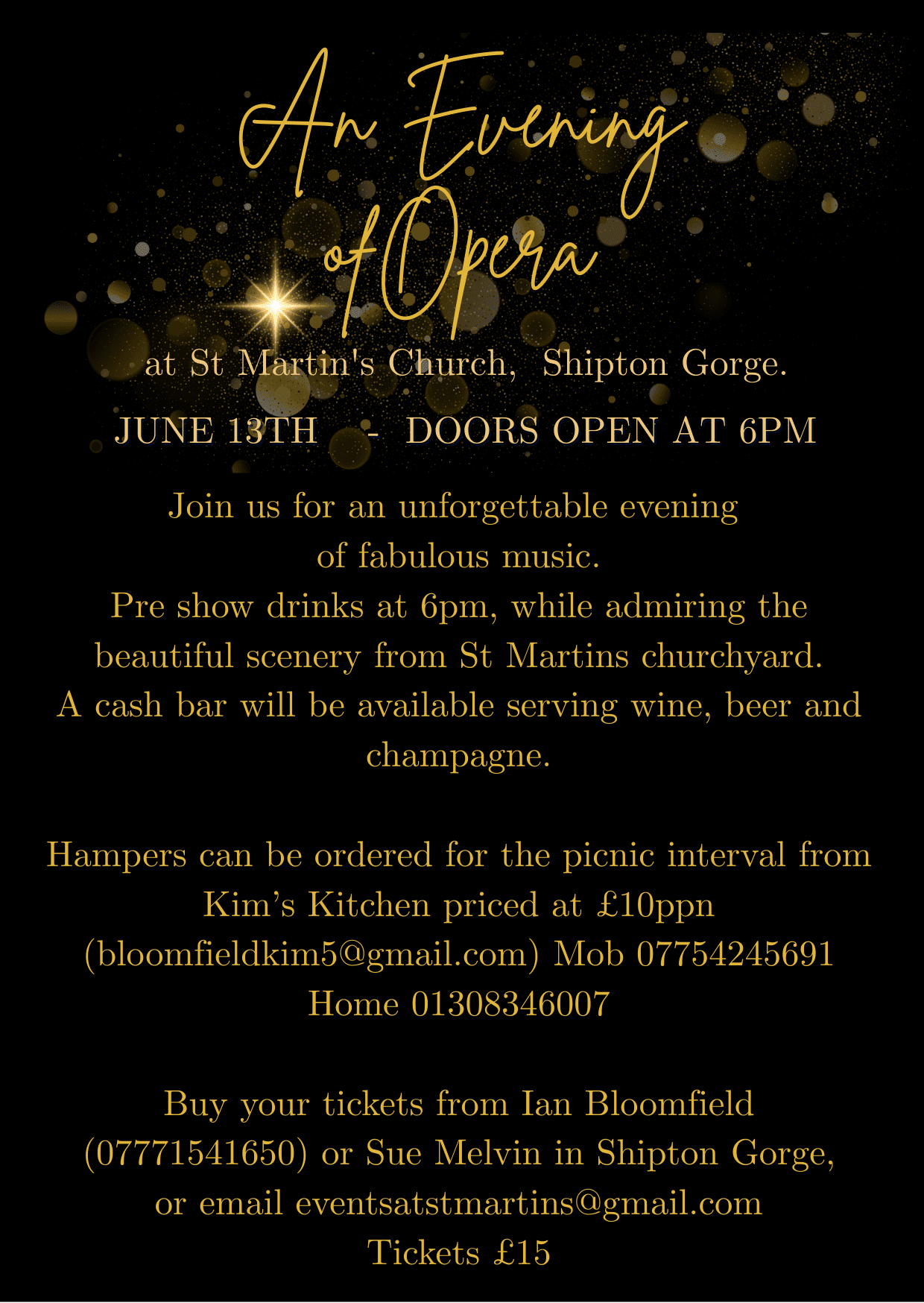 Buy your tickets from Ian Bloomfield (07771 541650) or Sue Melvin in Shipton Gorge. You can also email eventsatstmartins@gmail.com
