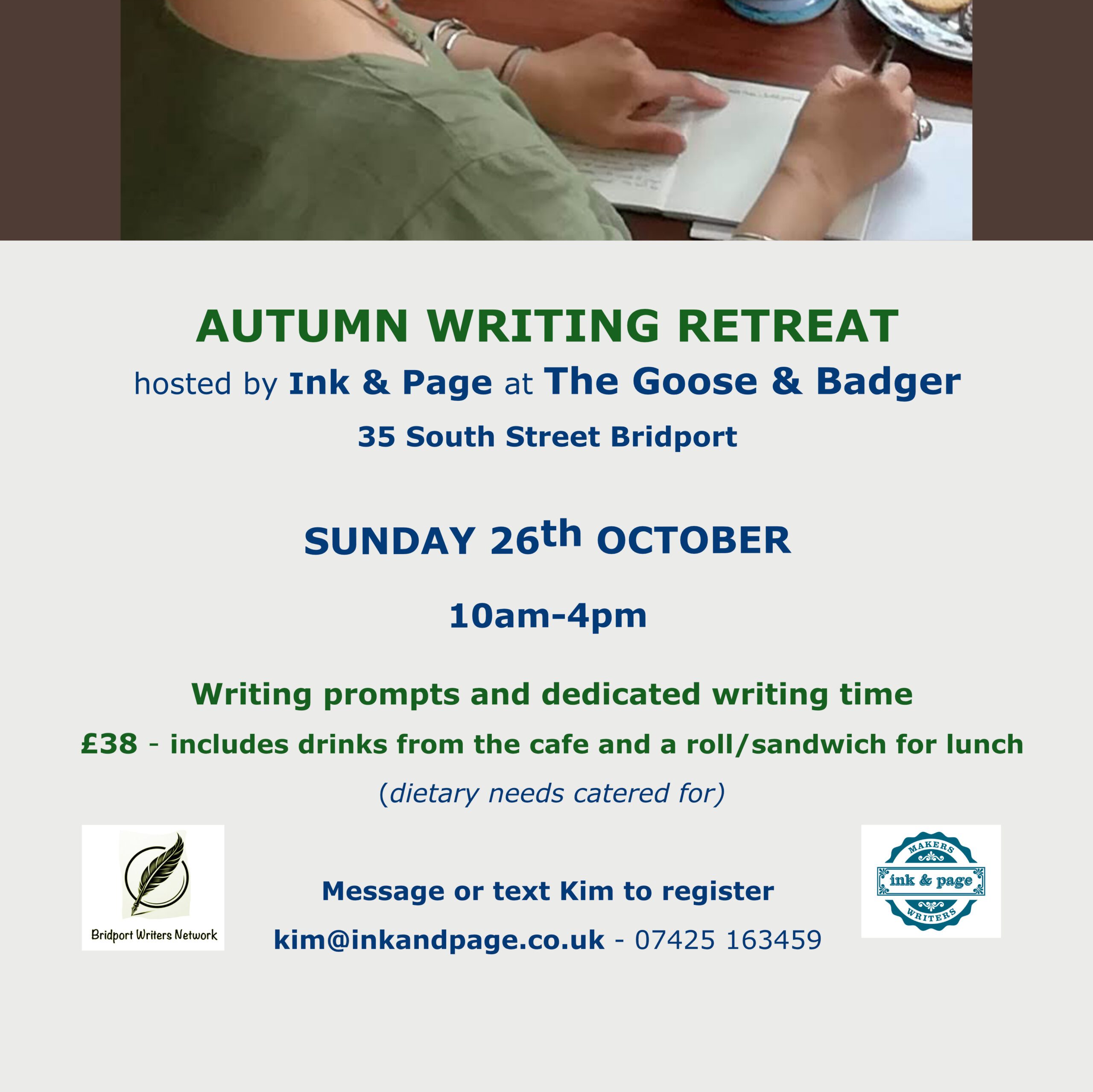 Hosted by Ink & Page Writing prompts and dedicated writing time £38 includes drinks from the café and a roll/sandwich for lunch