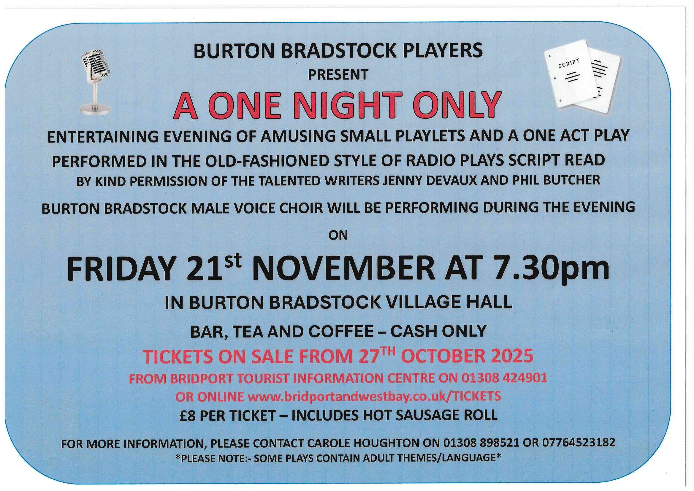 21nov7:30 PMBurton Bradstock Players present A One Night Only