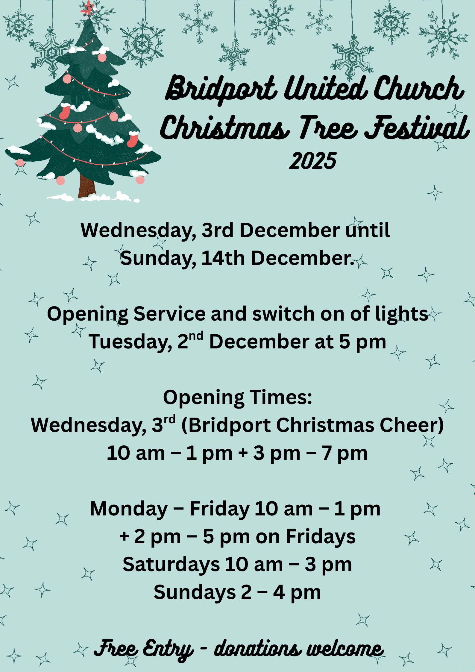 Opening Service: Tuesday 2nd December 5pm Also Christmas Cheer 10am -1pm then 3pm – 7pm Opening Hours: Monday to Thursday: 10am – 1pm Fridays: 10am – 1pm