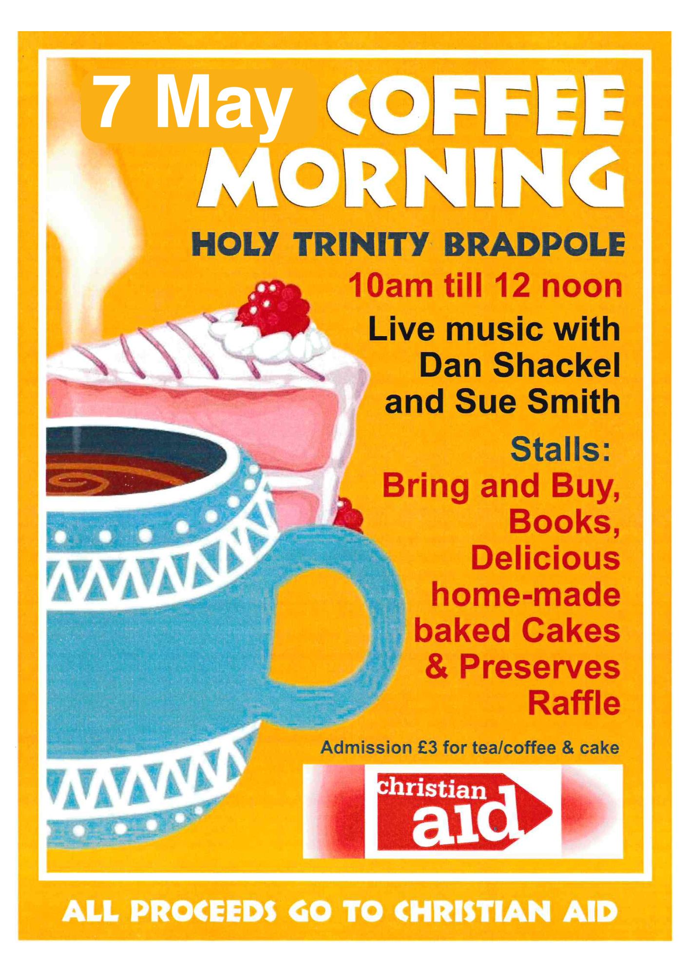 Live Music with Dan Shackel and Sue Smith Stalls too – Bring and Buy Books Delicious home-made cakes & preserves Raffle Admission £3 for tea/coffee and