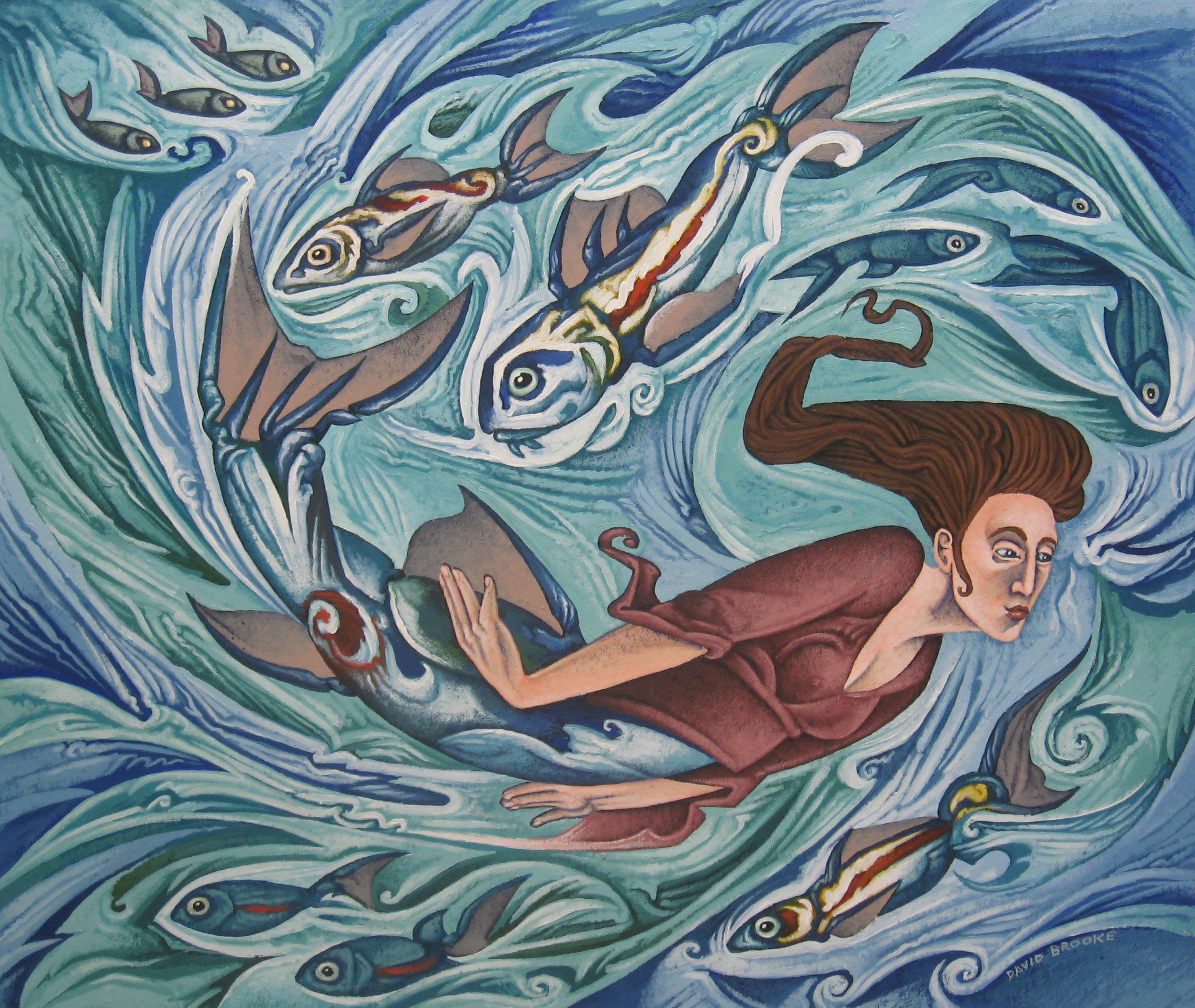 David Brooke is a well know local painter with a very individual style. His imagination allows him to stylise his characters and landscapes to achieve a mythical
