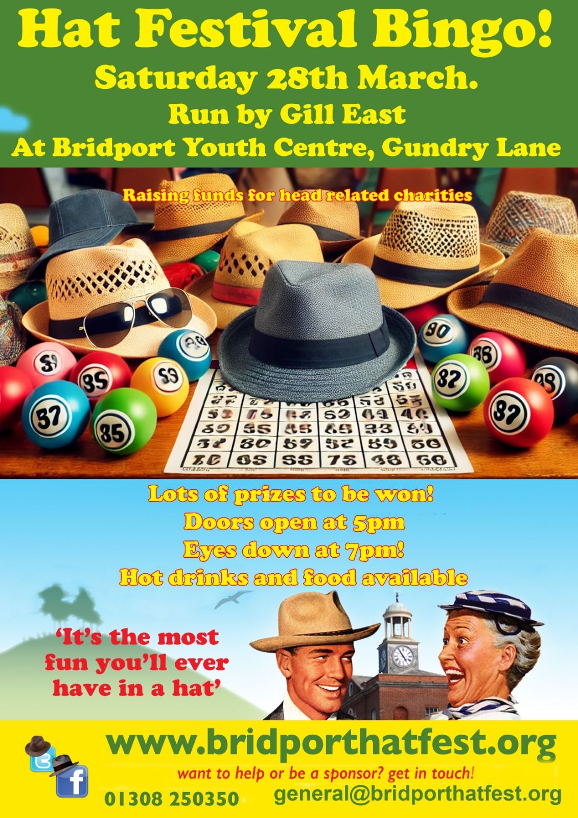 Lots of prizes to be won! Doors open at 5pm. Hot Drinks and Food available. www.bridporthatfest.org Want to help or be a sponsor? Get
