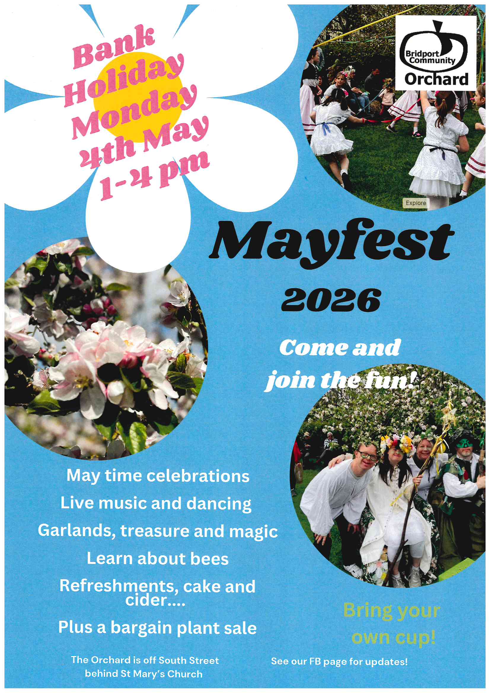 Once again, the whole community is invited to celebrate the coming of the apple blossom at our Mayfest in the St Mary’s Church Field orchard, in the heart of Bridport.