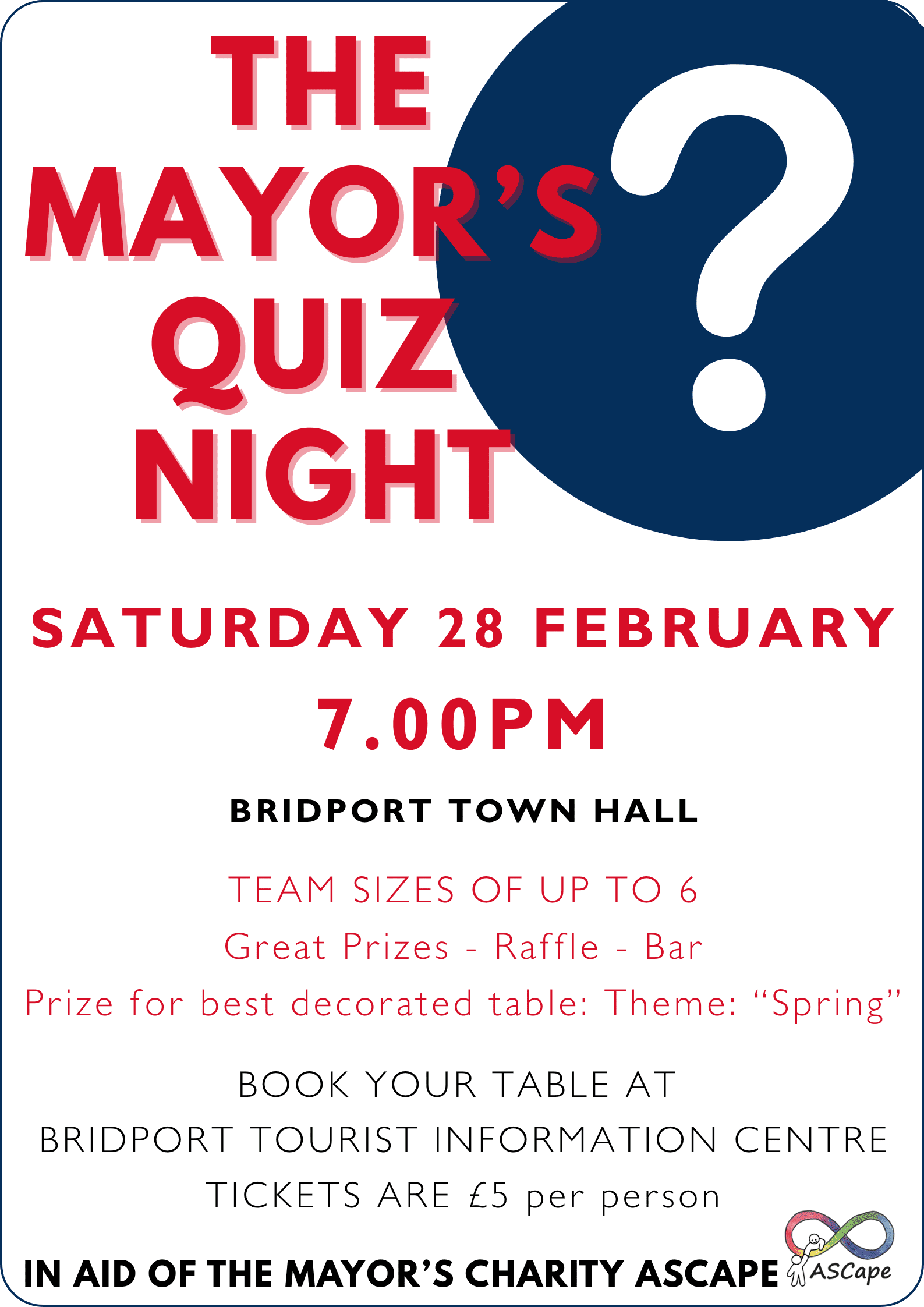 Test your quiz knowledge and help Bridport Mayor’s charities! Team sizes: up to 6 £5 per person